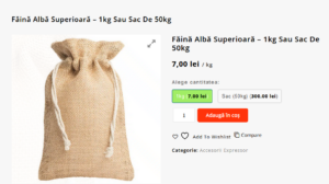 3. Opțiuni pentru selecție: Pe pagina de produs, clientul poate selecta între 1kg și sac (50kg).